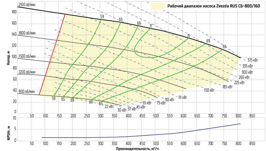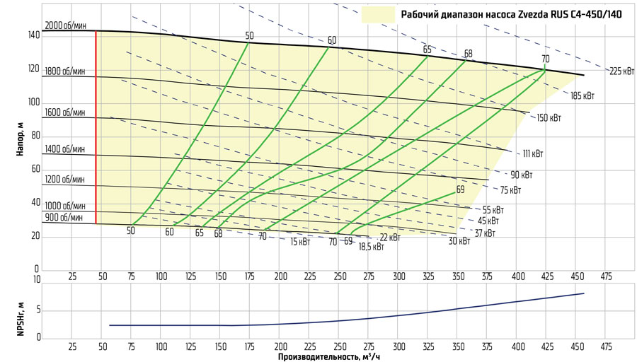 ! Расходы ниже 200 м³/ч не рекомендуются — насос приближается к минимально допустимому режиму и возрастает риск выхода из строя, КПД резко падает.